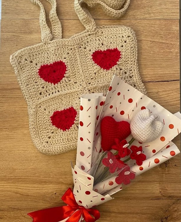 Un conjunto tejado que une la moda y la ternura en una sola propuesta. El bolso de mano pequeño, con su encantador diseño de cuadros salpicado de corazones rojos, llega acompañado de un delicado ramo de flores tejadas a mano. Elaborado todo con hilo de calidad, este dúo romántico es el regalo perfecto para quienes aman los detalles coquetos y llenos de significado: un accesorio con personalidad propia y un buquet eterno que nunca se marchita, listos para robar suspiros allí donde vayan.