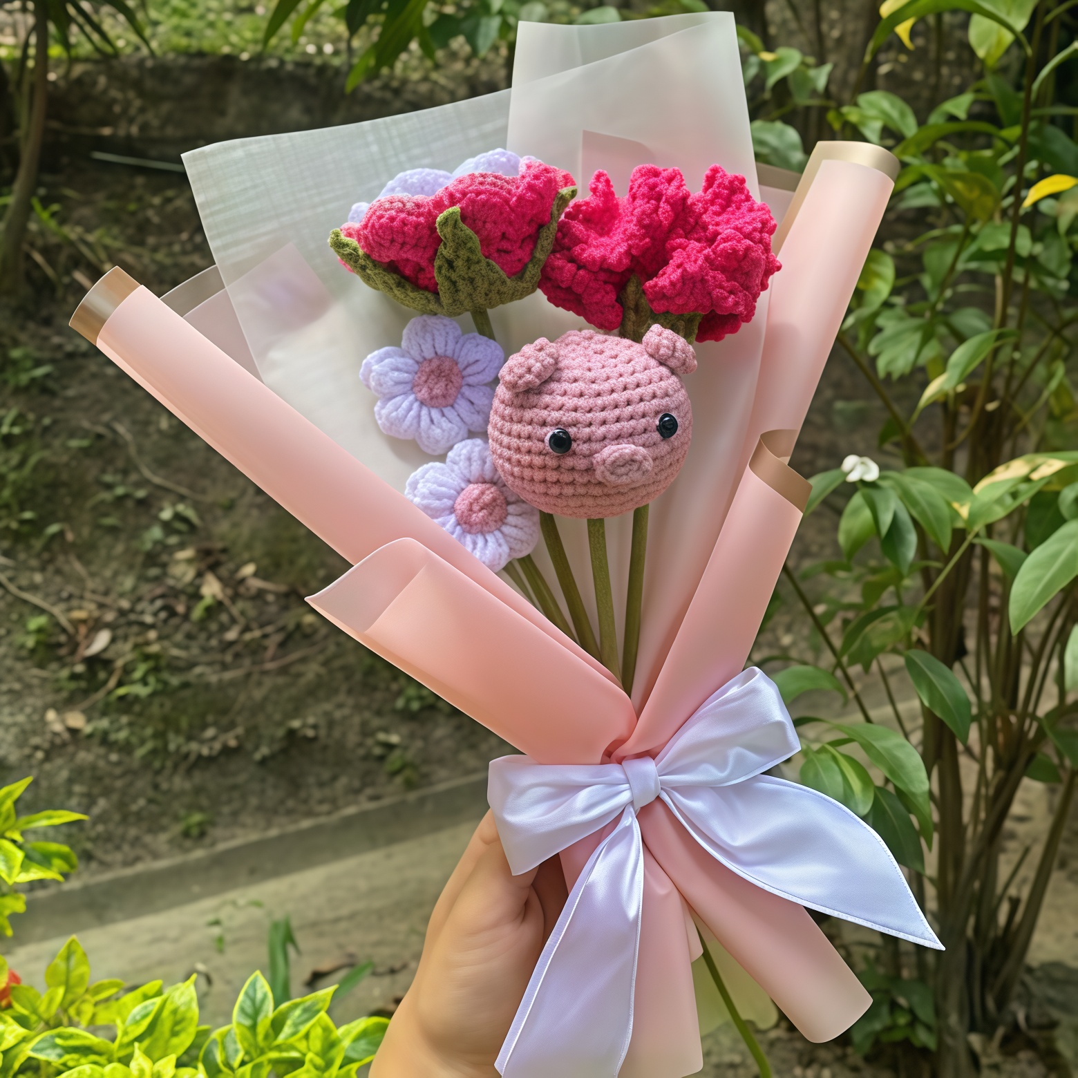 Un ramo tejado deliciosamente original y juguetón, donde la suavidad de dos margaritas tipo puf se combina con la ternura de una rosa, un clavel y un pequeño cerdito que asoma entre las flores. Esta mezcla inesperada de texturas y formas, toda elaborada a mano con hilo de calidad, crea un conjunto lleno de personalidad y encanto campestre. Perfecto para quienes buscan un detalle diferente, divertido y con ese toque tierno que invita a sonreír.
