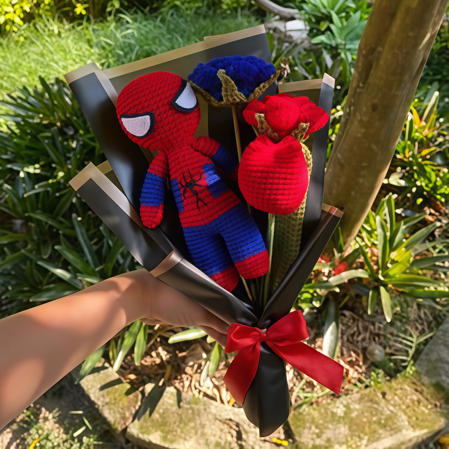 Un ramo tejado que demuestra que también los superhéroes tienen su lado más tierno. Dos rosas y un tulipán, elaborados con delicadeza, acompañan a Spiderman, un amigurumi de 15-17 cm listo para balancearse entre los pétalos. Este conjunto combina la suavidad de las flores con la energía del trepamuros, creando un contraste divertido y lleno de personalidad. Todo hecho a mano con hilo de calidad, es el regalo perfecto para quienes aman las flores pero nunca pierden su espíritu heroico.